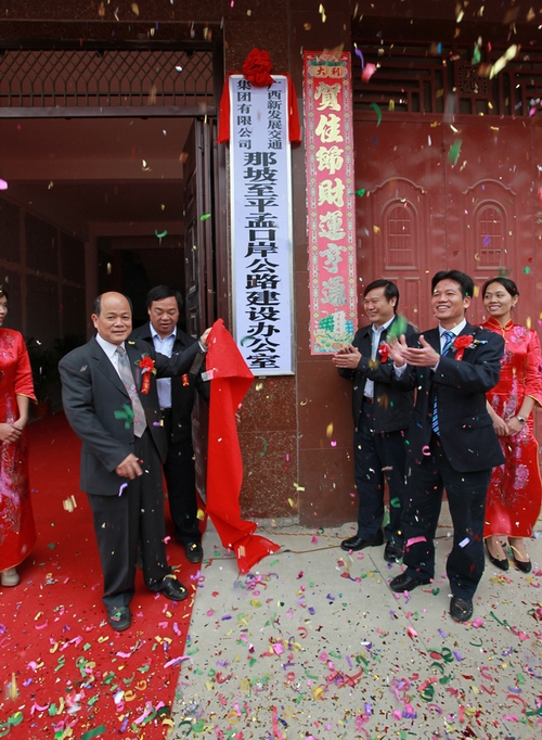 自治區交通運輸廳紀檢組長、廳黨組成員朱名勝(左一)、集團公司董事長朱堅和(右二)等領導為項目建設辦公室揭牌