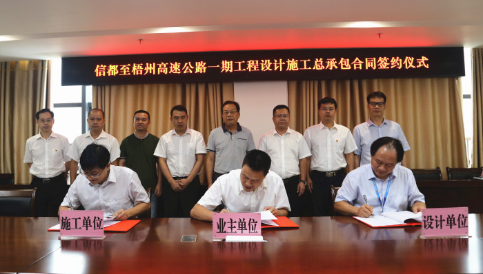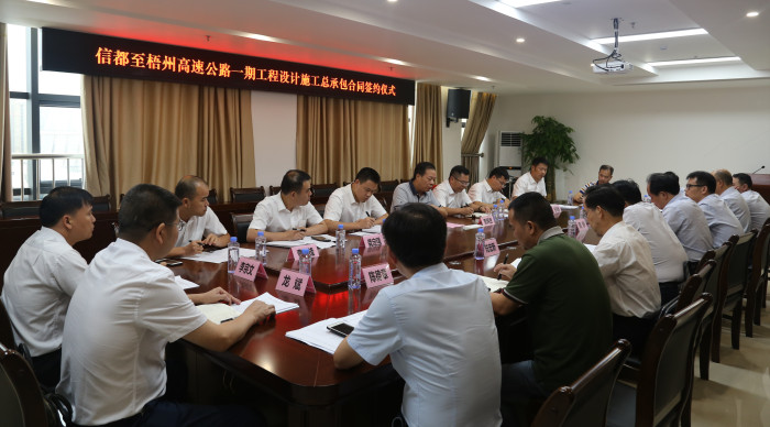 2019年7月22日下午,信都至梧州高速公路一期設計施工承包合同簽約儀式在廣西智慧交通研發中心1926會議室舉行。北投集團總工程師覃炳賢,公司領導賴水平、藍日彥、龔定強、蘇偉勝及中標單位路建集團、交通設計集團的領導以及各單位相關部門代表參加儀式。